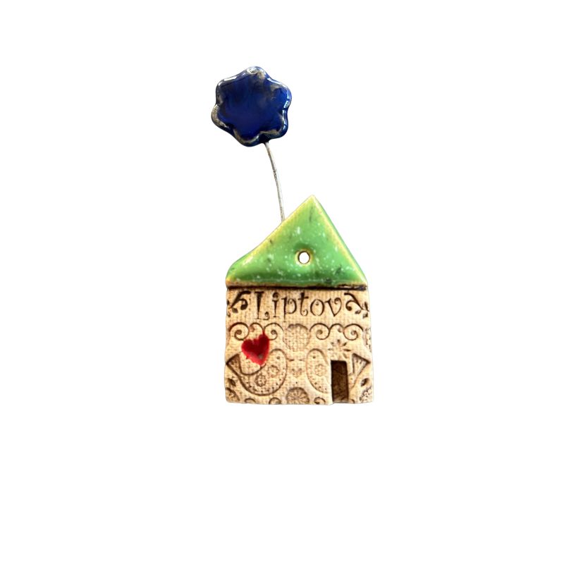 Dekoratívny hlinený domček zdobí detailná textúra s folklórnym motívom a červeným srdiečkom. Nad zelenou strechou sa na jemnom drôtiku nachádza modrý keramický kvietok, ktorý dodáva dekorácii hravosť a dynamiku. Ručne razený nápis „Liptov“ robí z domčeka originálny suvenír pripomínajúci krásu tohto regiónu.